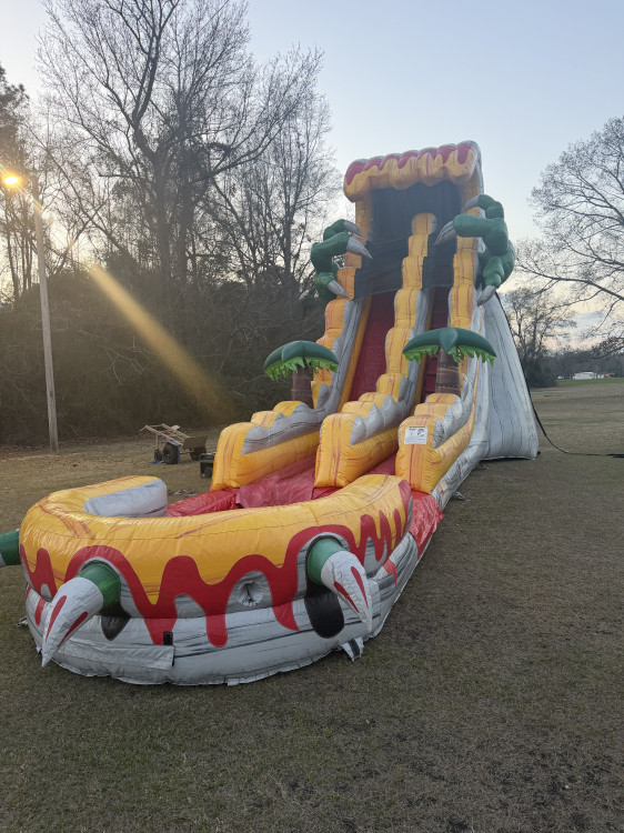 Make your party unforgettable with our 20-foot T-Rex Terror Water Slide Rental in Myrtle Beach! This giant dinosaur-themed waterslide rental is perfect for backyard parties, birthday parties, school events, church events, and summer celebrations. Standing 20 feet tall, this inflatable water slide delivers fast, thrilling fun while keeping kids cool in the South Carolina heat.